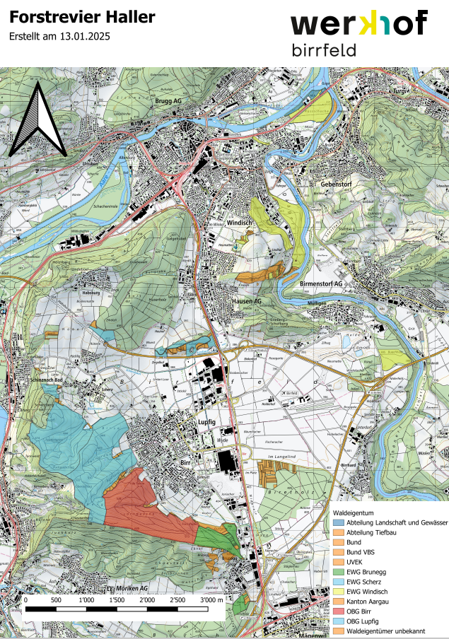 Unser Bereich Forst pflegt und bewirtschaftet eine Waldfläche von 505 ha (410 ha Wirtschaftswaldfläche und 95 ha Privatwaldfläche) und ist erster Ansprechpartner in allen Fragen der Waldbewirtschaftung. Er erstreckt sich über die Gemeinden Birr, Lupfig, Brunegg und Windisch.